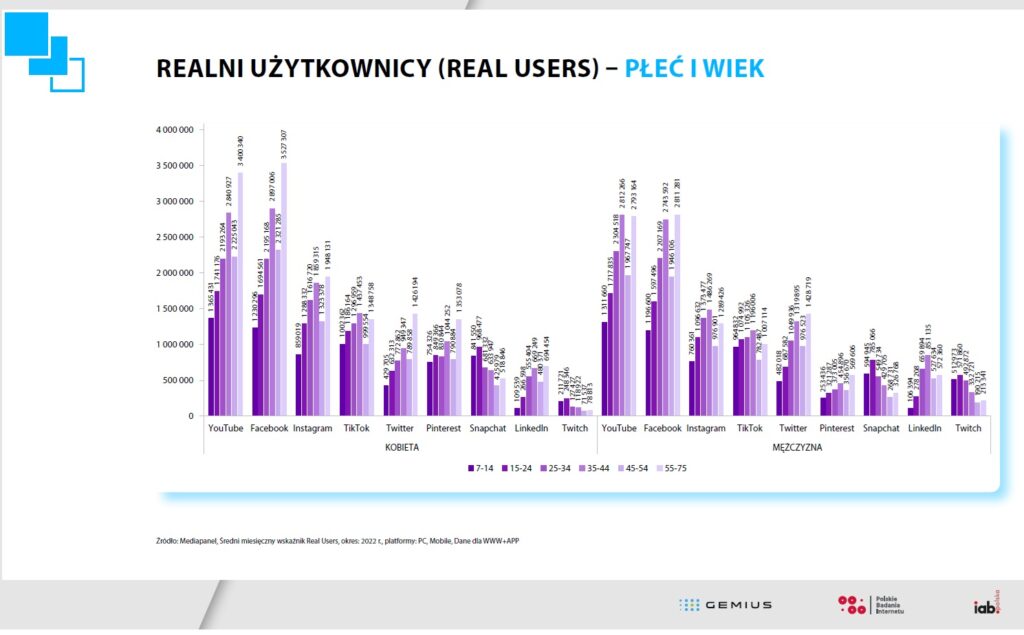 Rys. 2: Realni użytkownicy poszczególnych platform społecznościowych. Źródło – raport Gemius.