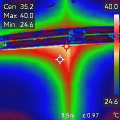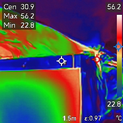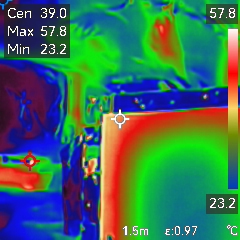 Na poniższych zdjęciach można zaobserwować straty ciepła w centrali wentylacyjnej jednej z niemieckich firm, spowodowane dużymi mostkami ciepła. Było to urządzenie wyciągające powietrze o dość wysokiej temperaturze, sięgającej 60 stopni, gdzie różnice temperatur na narożach profili w stosunku do środka paneli rewizyjnych osiągały różnicę blisko 30 stopni! Tak duża różnica temperatur na obudowie jest niedopuszczalna i powinna dyskryminować takie urządzenie, gdyż naraża użytkownika na duże straty!