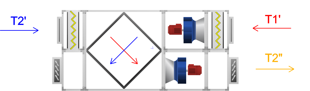 – T2″ – temperatura powietrza nawiewanego po odzysku ciepła,