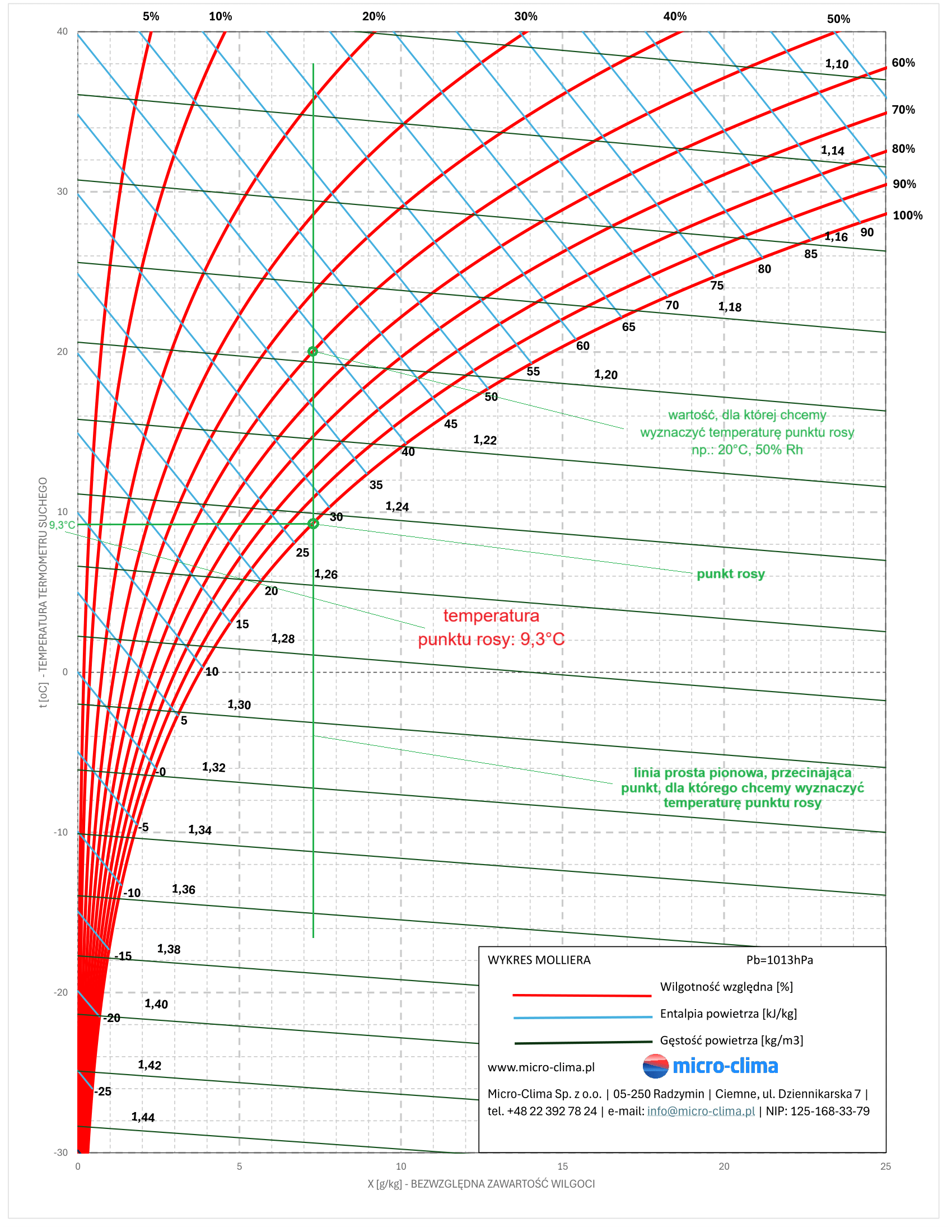 Sposób wyznaczenie temperatury punktu rosy na podstawie wykresu Molliera